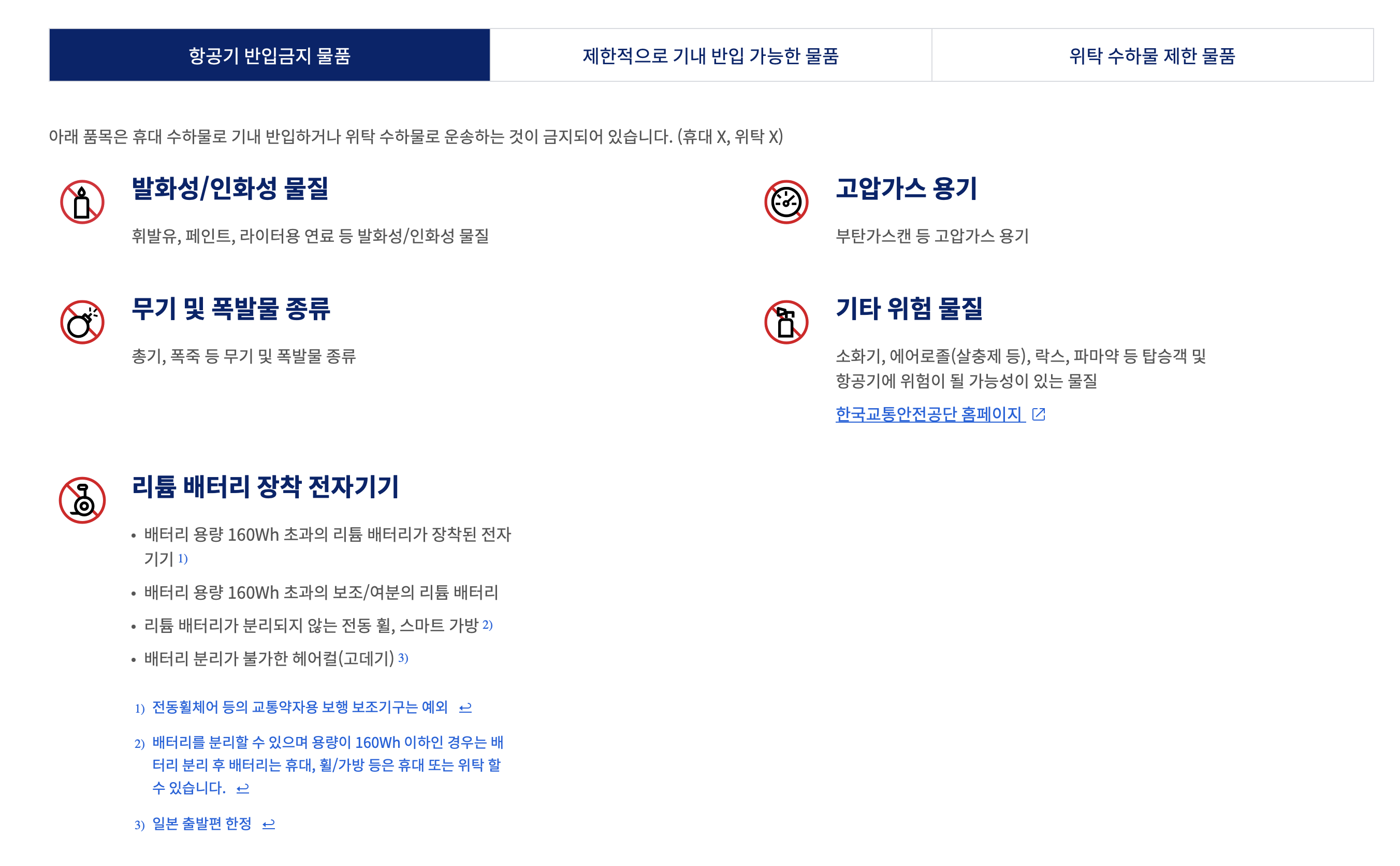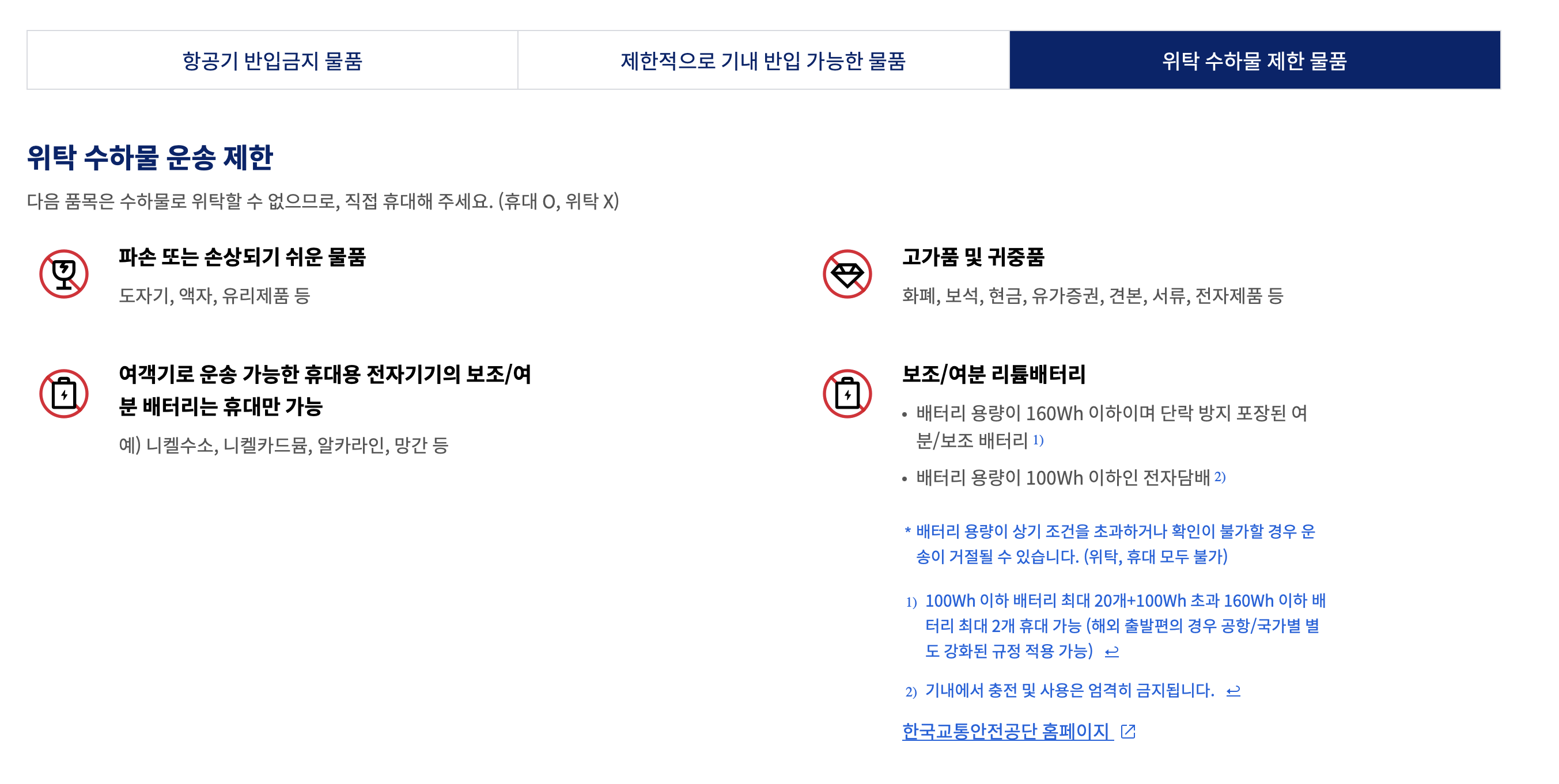다음 품목은 수하물로 위탁할 수 없으므로, 직접 휴대해 주세요 (휴대가능, 위탁수하물 불가능)