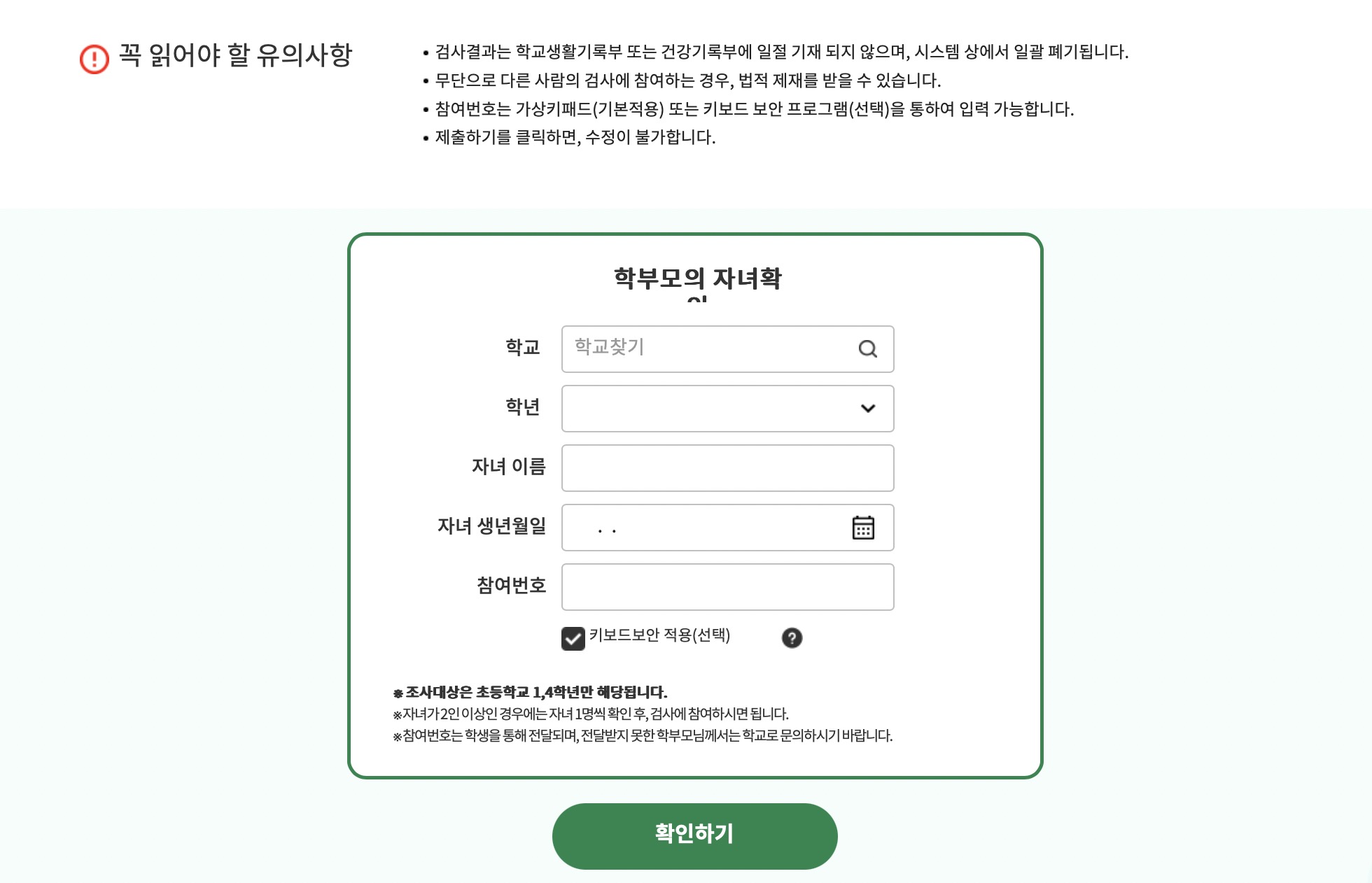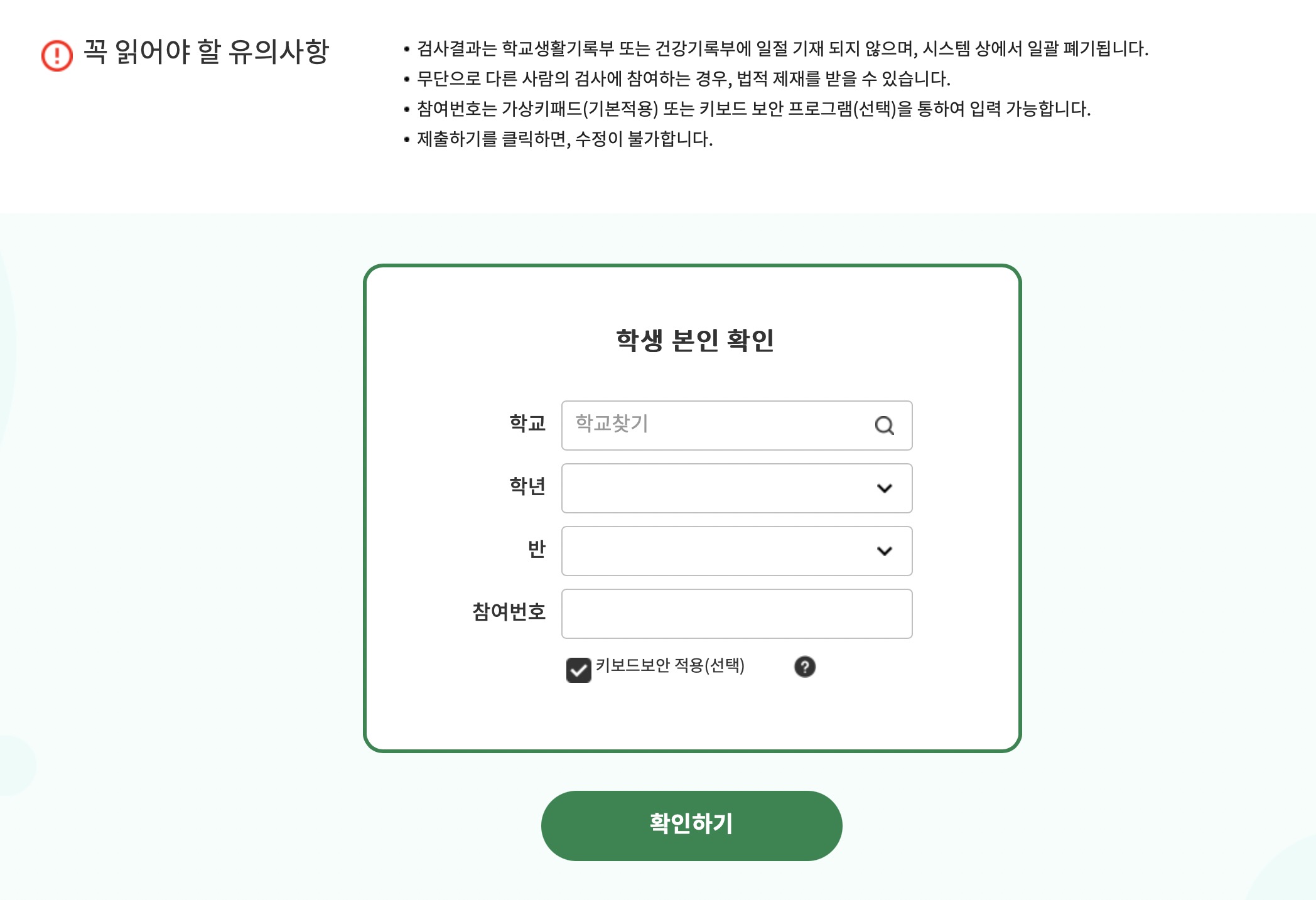 검사결과는 학교생활기록부 또는 건강기록부에 일절기재되지 않으며 시스템 상에서 일괄 폐기됩니다.