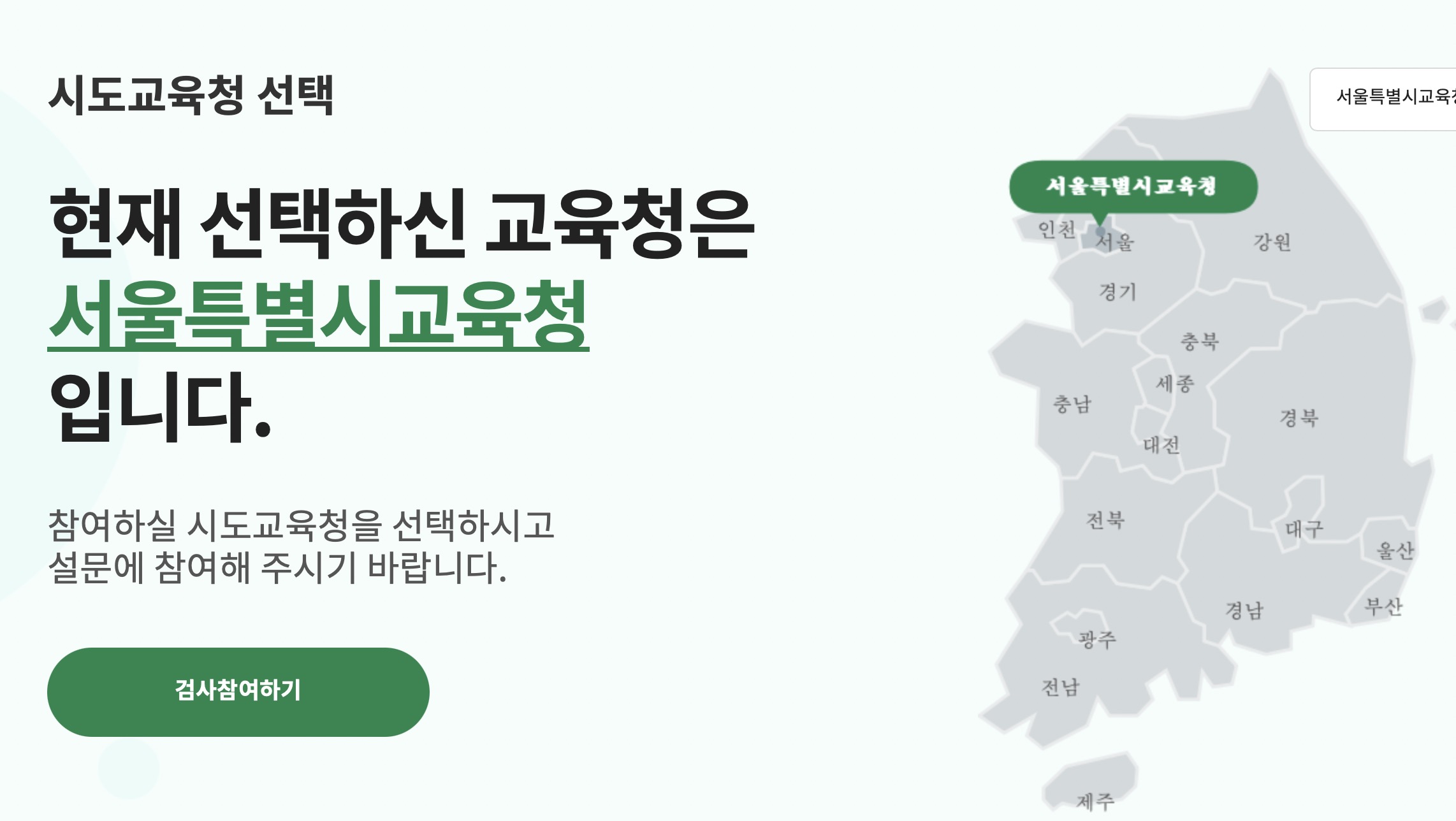 초등생 자녀를 두신 부모 중 한분이 조사에 참여하시면 되는에, 역시 자녀가 재학중인 학교가 소속된 시도교육청을 먼저 선택해주시고요, 이후 학교찾기로 자녀의 재학중 학교명을 검색하시고, 학년과, 자녀이름, 자녀 생년월일, 참여번호를 입력해서 인증 후 검사를 진행해주세요.