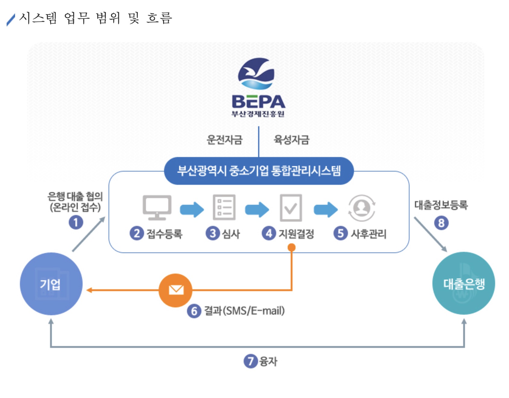 기업이 온라인으로 은행대출 협의를 부산경제진흥원에 접수, 접수등록 후 심사 지원결정 사후관리까지 BEPA 부산경제진흥원이 도움을 제공합니다. 기업에게는 지원결정 여부를 SMS와 이메일로 안내합니다. 은행은 해당 기업에게 융자를 제공하고 부산 중소기업 통합관리시스템을 통해 대출은행에게 대출정보 등록을 제공합니다.