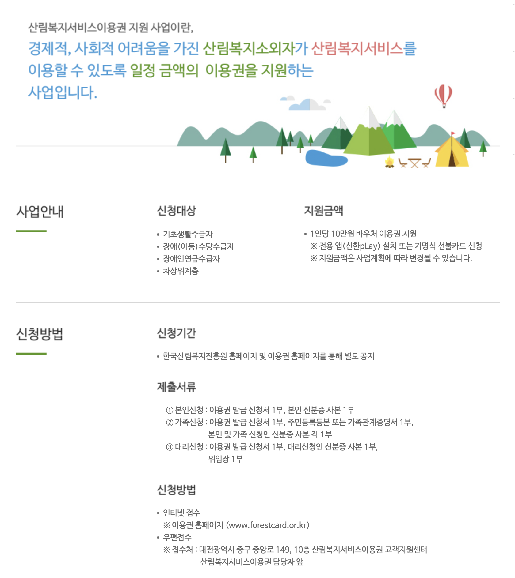 산림복지서비스이용권 지원 사업이란, 경제적 사회적 어려움을 가진 산림복지소외자가 산림복지서비스를 이용할 수 있도록 일정 금액의 이용권을 지원하는 사업입니다.