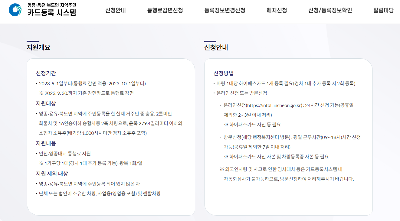 영종 용유 북도면 지역에 주민등록을 한 실제 거주민 중 승용, 2톤미만 화물차 및 16인승 이하 승합차 중 2축 차량으로 윤폭 279.4밀리미터 이하의 소형차 소유주 (배기량 100씨씨 미만 경차 소유주 포함) 분들을 대상으로 인천대교 영종대교 통행료를 지원합니다.