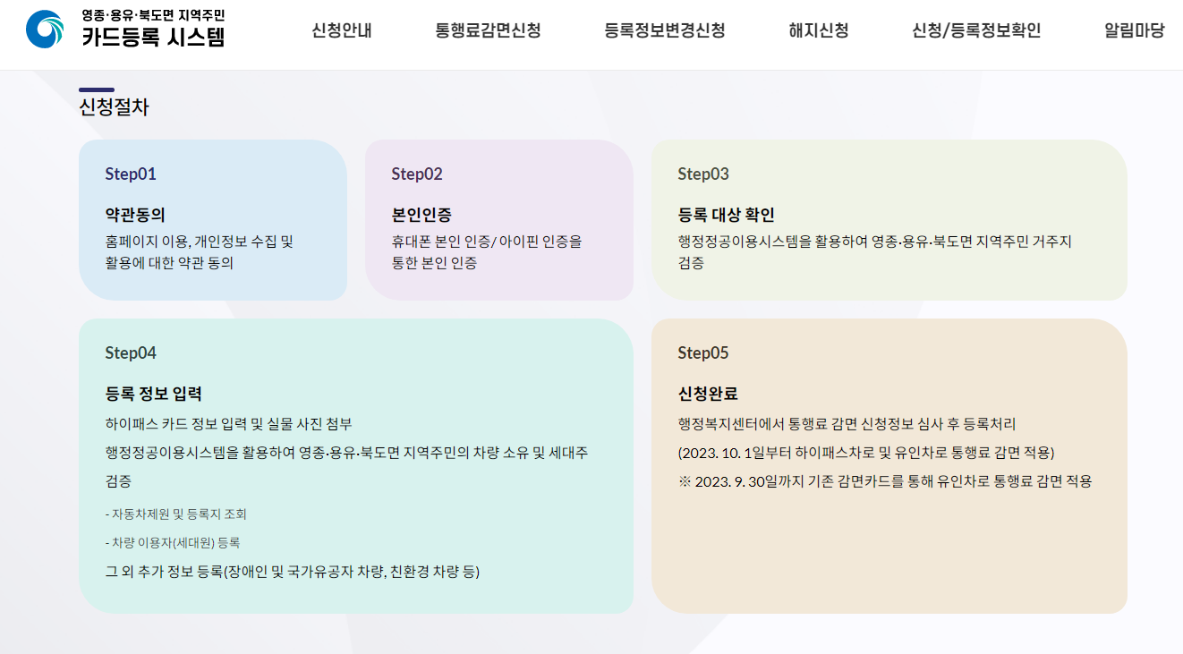 영종·용유·북도면에 주민등록을 두고 거주하시는 지역주민들에게는 가구당 1대 1일 왕복 1회 영종대교 인천대교 통행료를 지원합니다. 해당하시는 분들은 통행료 감면신청을 해주시기 바랍니다.
