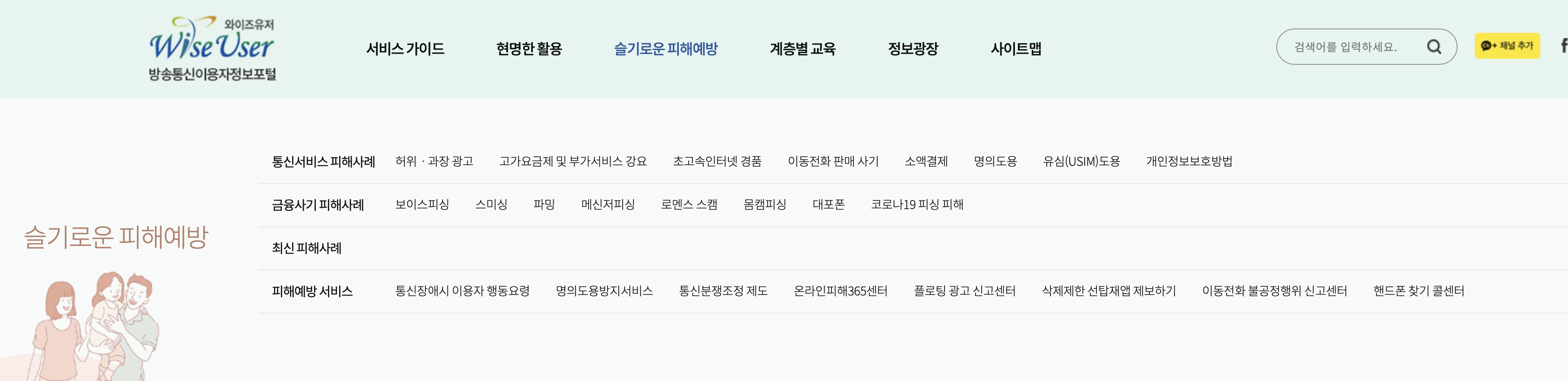 슬기로운 피해예방코너에서는 통신서비스의 허위과장광고, 고가요금제 및 부가 서비스 강요, 초고속인터넷경품, 이동전화 판매사기, 소액결제, 명의도용 등 다양한 문제와 피해에 대한 예방교육과 해결법을 안내해줍니다.