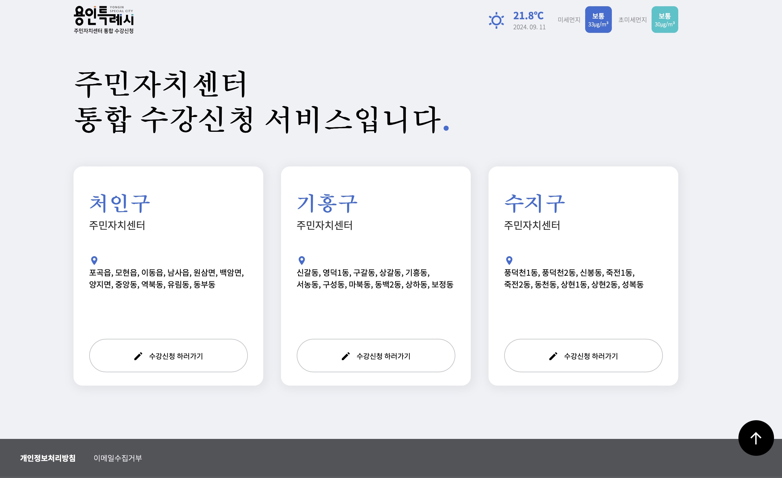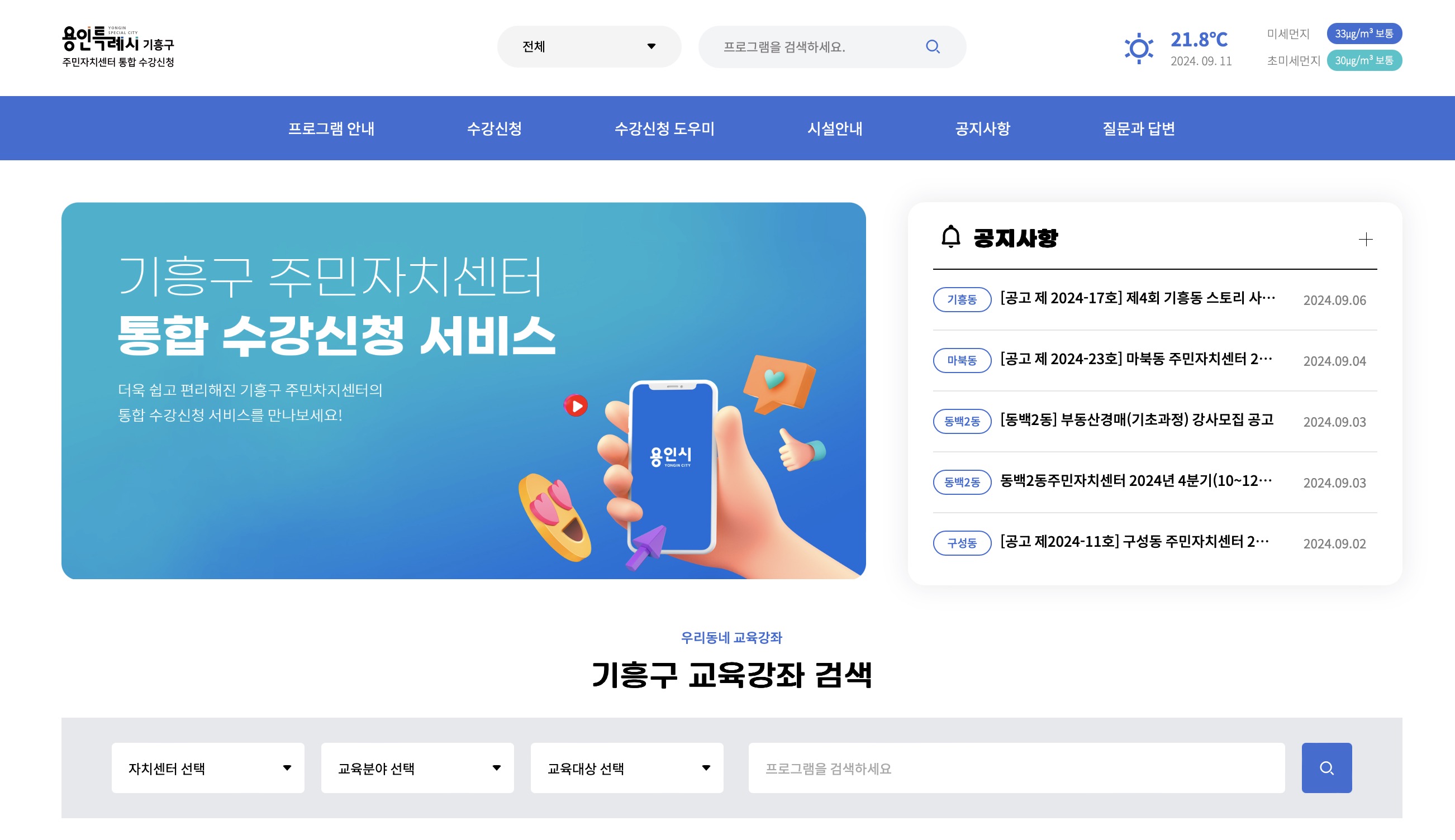 * 기흥구가 아닌 처인구 수지구에 거주하시는 분들은 해당하는 지역 주민센터 수강신청 페이지를 이용하시기 바랍니다.