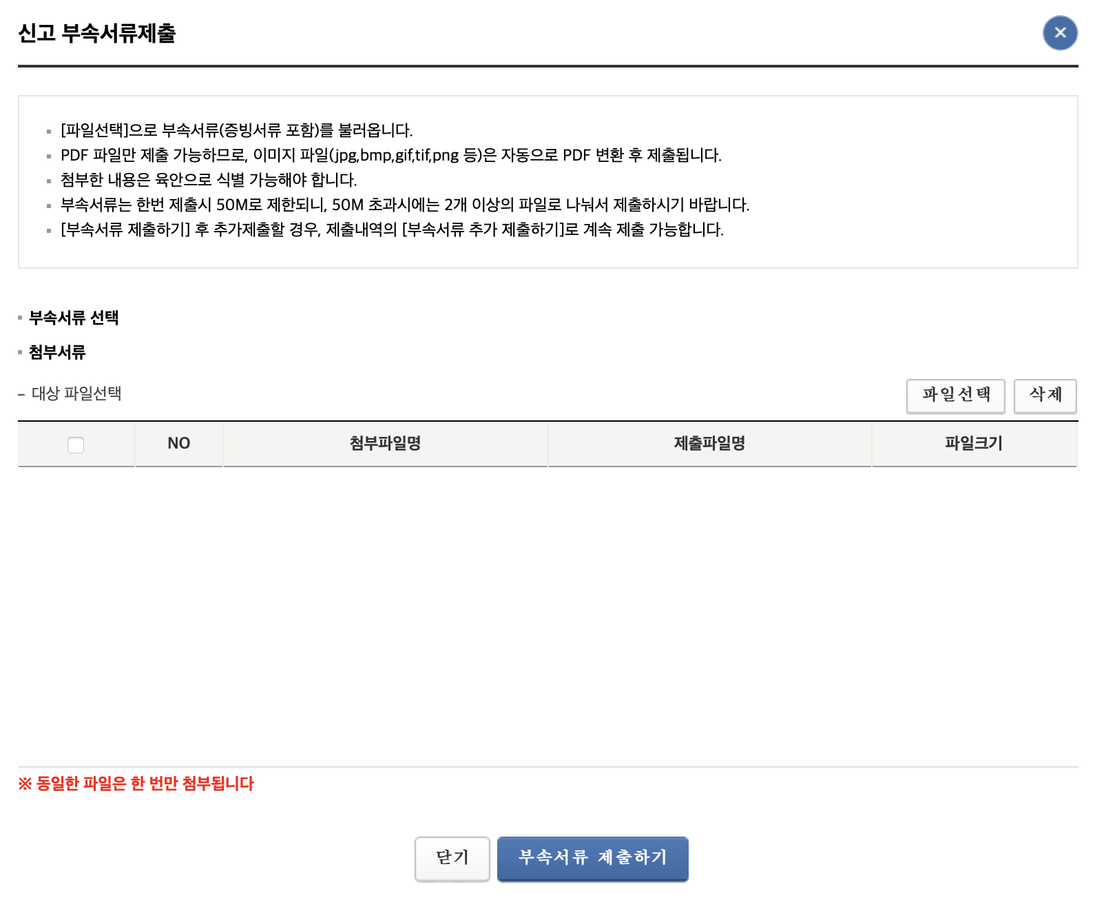 부속서류는 한번 제출 시 50M로 제한되니, 50메가 초과시에는 2개 이상의 파일로 나눠서 제출하시기 바랍니다.