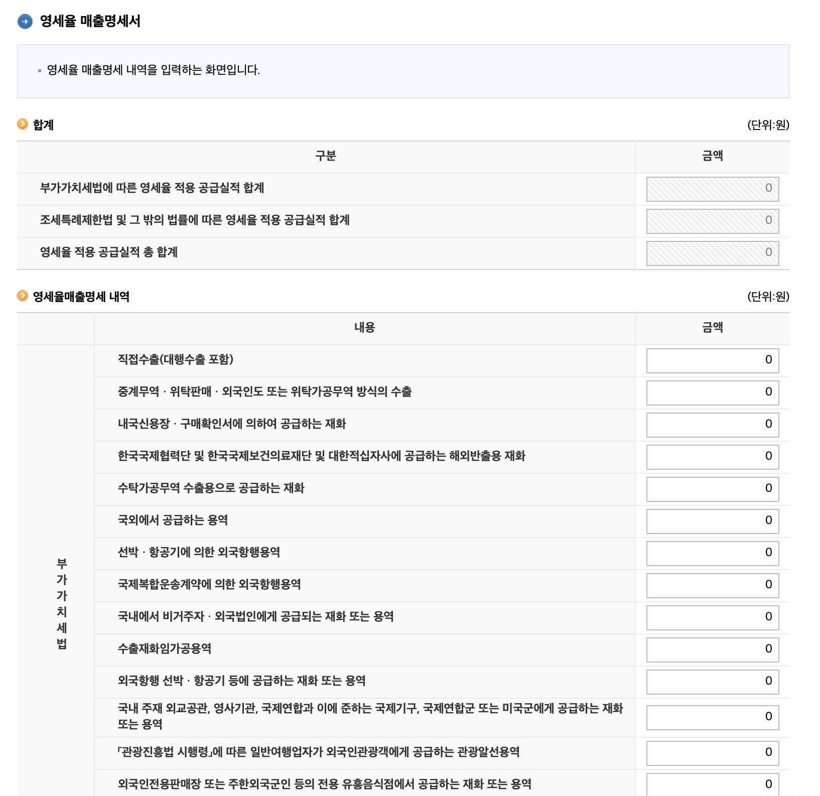 과세표준금액과 영세율매출 금액이 동일하게 입력되어야 합니다.