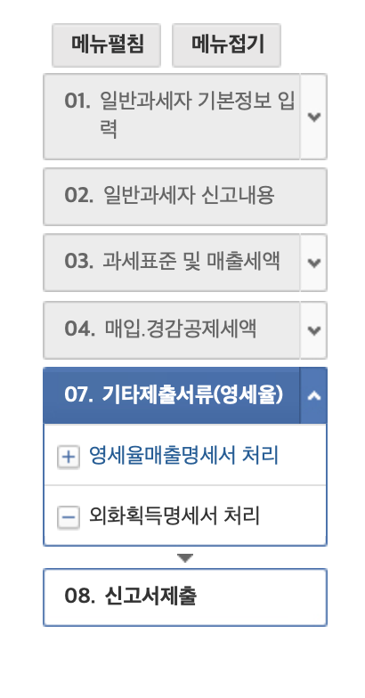 중간에 07번 기타제출서류 (영세율) 관련 영세율매출명세서처리를 해주어야 합니다.