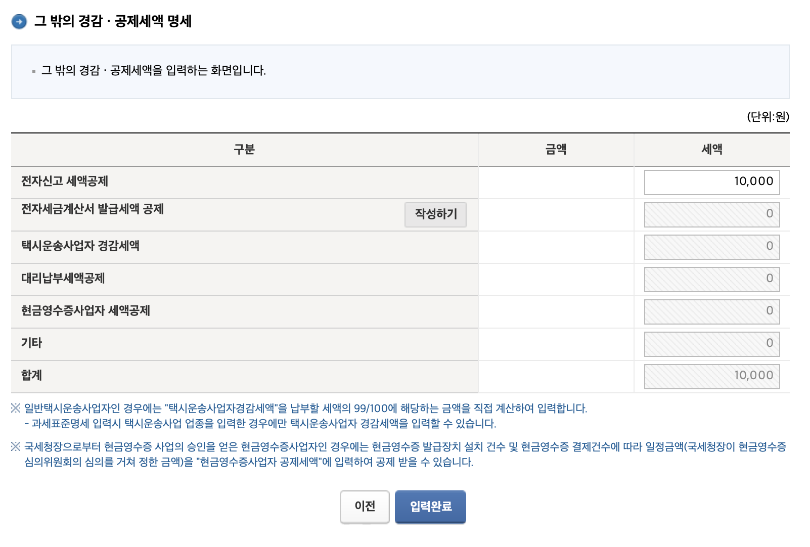여기서 그대로 저장하고 다음으로 넘어가면 경감 공제세액 명세가나오는데 기본적으로 홈택스 전자신고 세액공제 10,000원을 적용받고 입력완료를 누르면