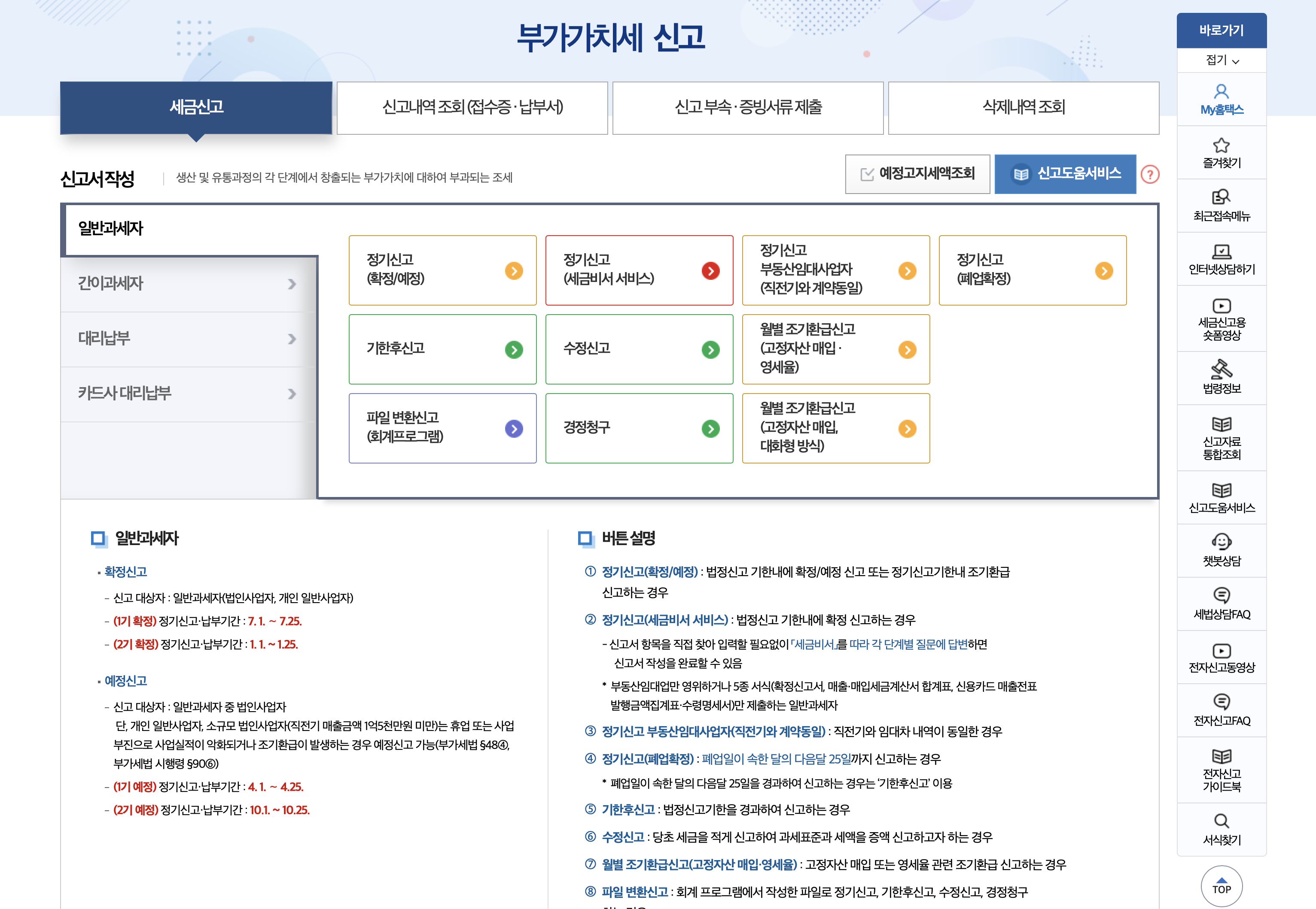 부가가치세 신고 페이지에서 일반과세자 정기신고 (확정/예정)을 눌러주세요. 영세율매출 신고는 정기신고(세금비서 서비스)로 하실 수 없습니다.