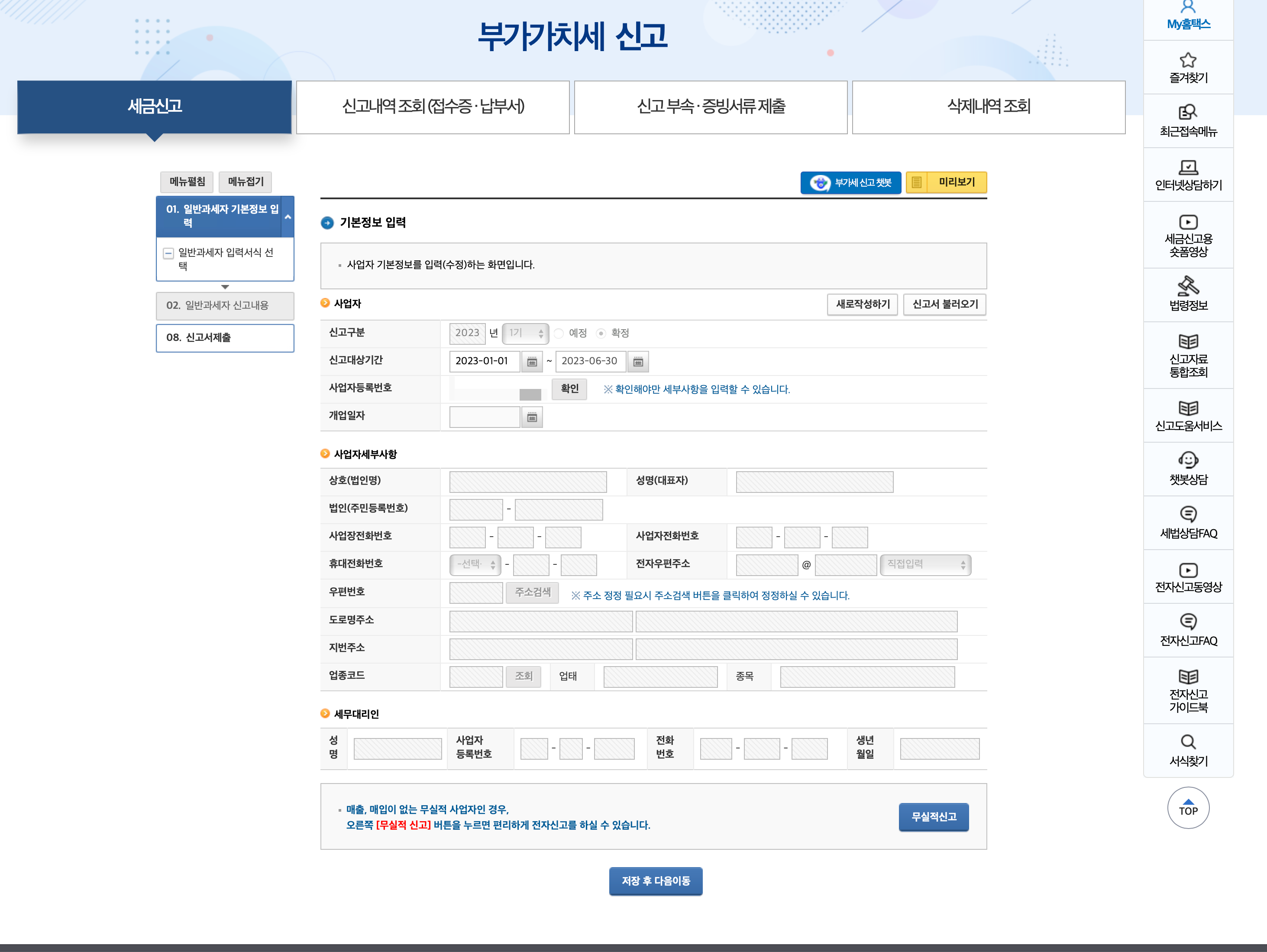 신고서식을 불러오시면 신고구분과 신고대상기간 사업자등록번호 확인을 눌러주시면 사업자세부사항이 불러와 집니다.
