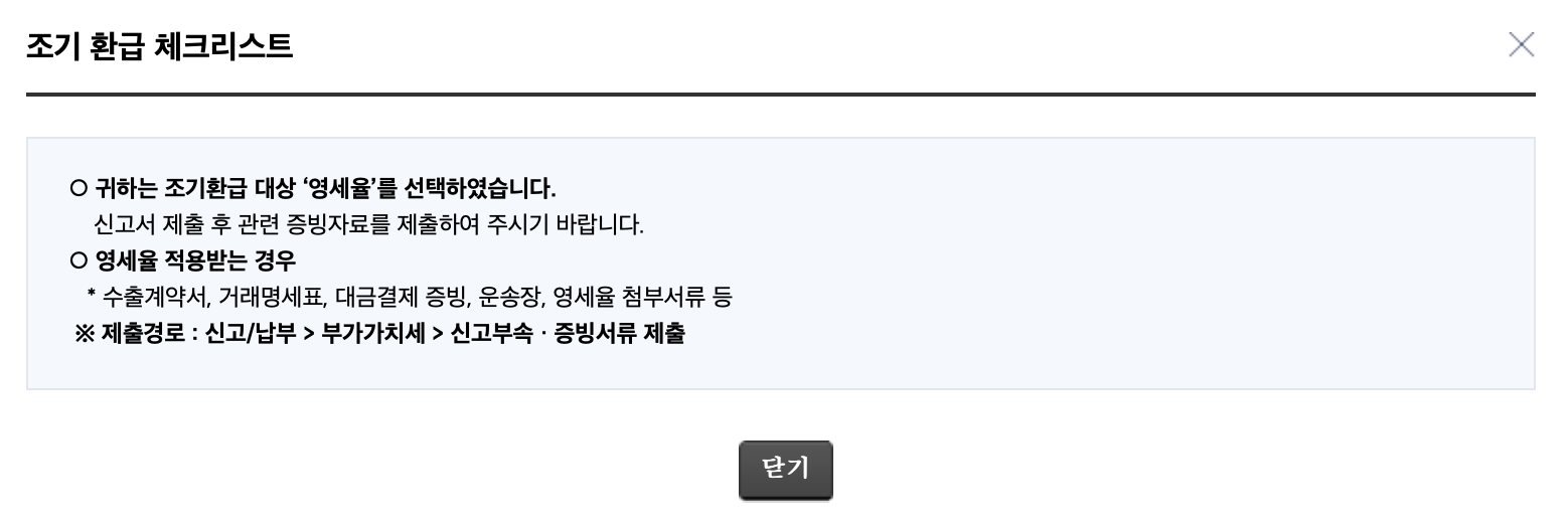 그러면 아래처럼 조기환급 체크리스트가 나오고, 영세율을 적용받는 경우 수출계약서, 거래명세표, 대금결제 증빙, 운송장, 영세율첨부서류 등을 증빙서류로 제출하라는 안내가 나타납니다.