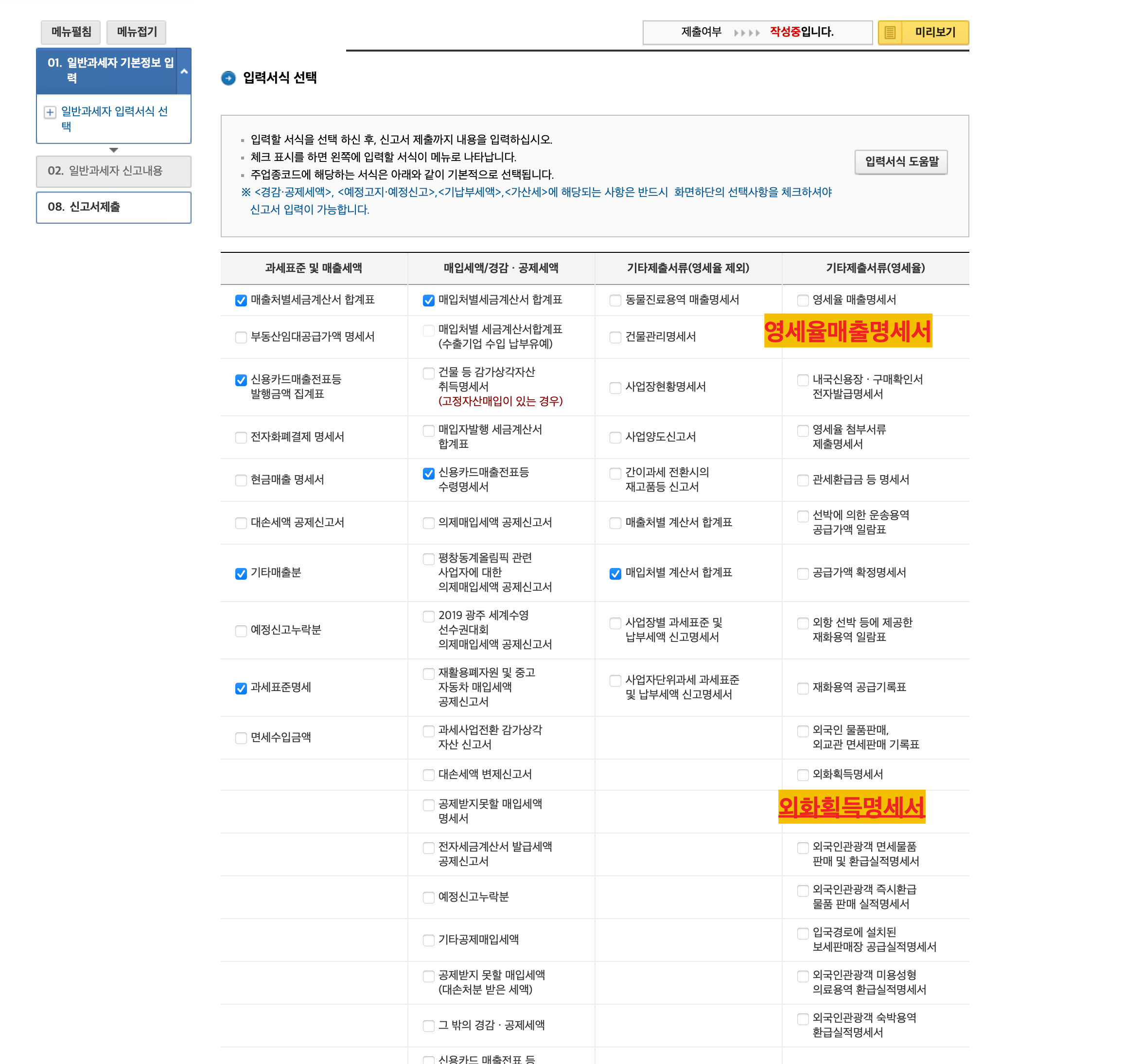 그리고 넘어가면 자동으로 아래처럼 제출해야 하는 내역이 자동으로 체크되어 있습니다. 애드센스 신고를 위해서는 별도로 영세율매출명세서와 외화획득명세서를 체크해주세요.
