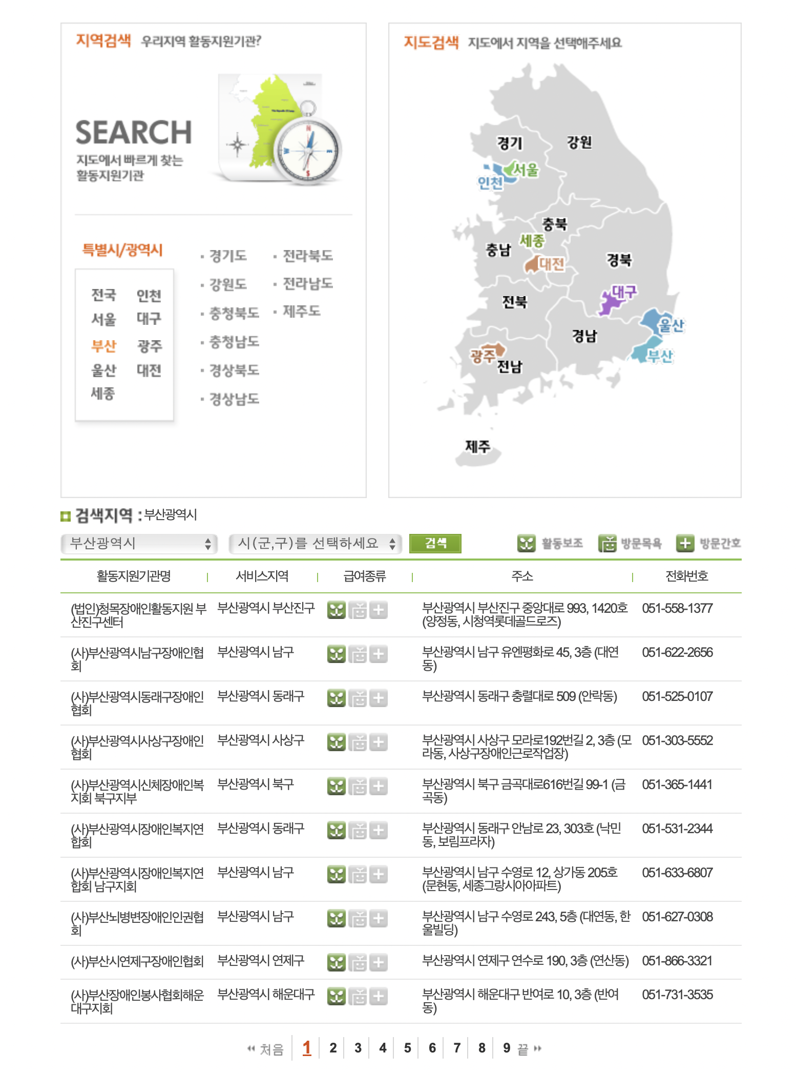 1. 장애인활동지원 : 활동지원 기관 검색을 통해 거주하시는 지역으로 검색범위를 좁혀서 검색을 진행하시면 교육기관과 모집종류도 확인하실 수 있습니다.