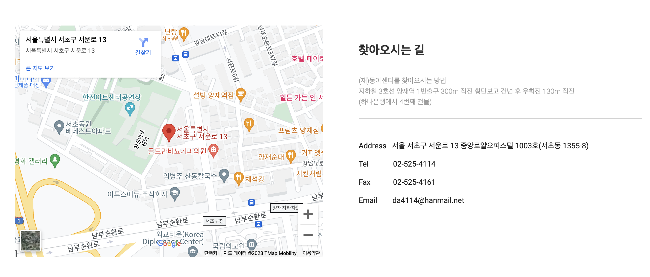 (재)동아센터를 찾아오시는 방법 - 지하철 3호선 양재역 1번출구 300m 직진 횡단보도 건넌 후 우회전 130m 직진 (하나은행에서 4번째 건물)
