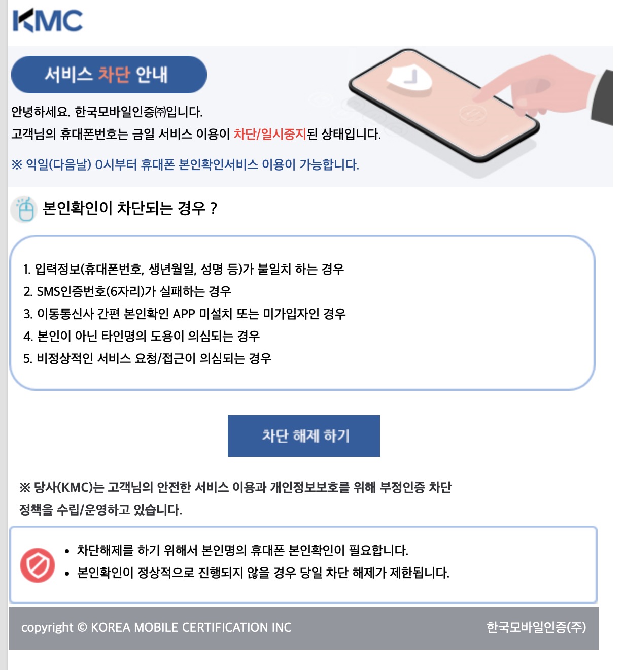 본인확인 즉시차단해제 안내 | 한국모바일인증(주)