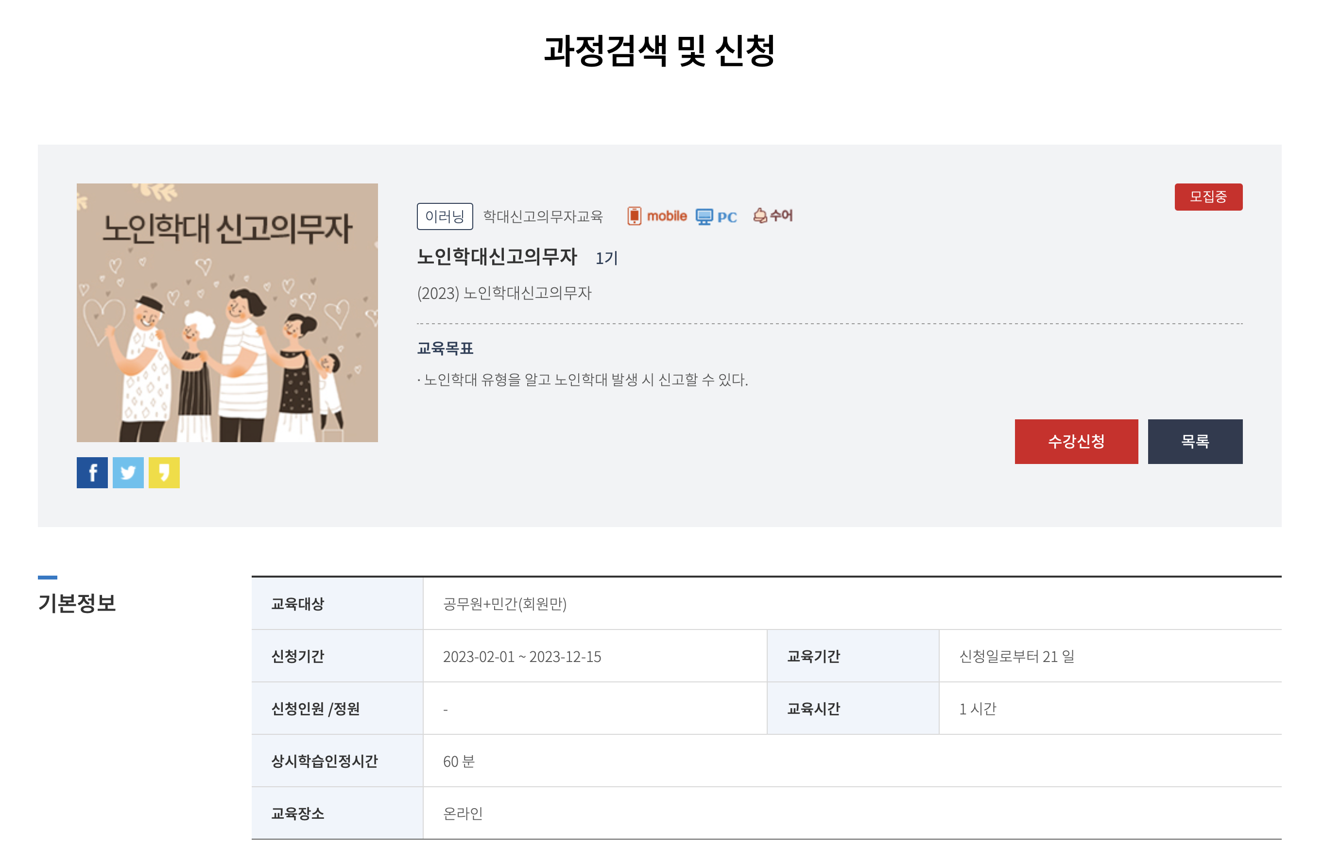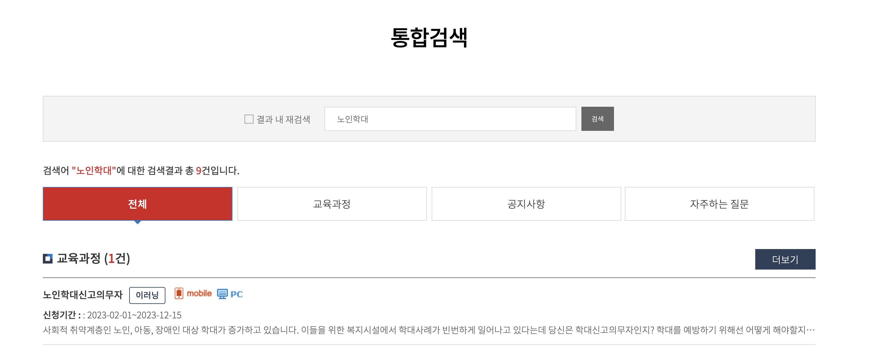 검색창에 '노인학대신고의무자' 를 검색하시면 이러닝 과정으로 해당 교육과정을 확인할 수 있습니다. 모바일과 PC에서 모두 수강하실 수 있도록 지원됩니다.