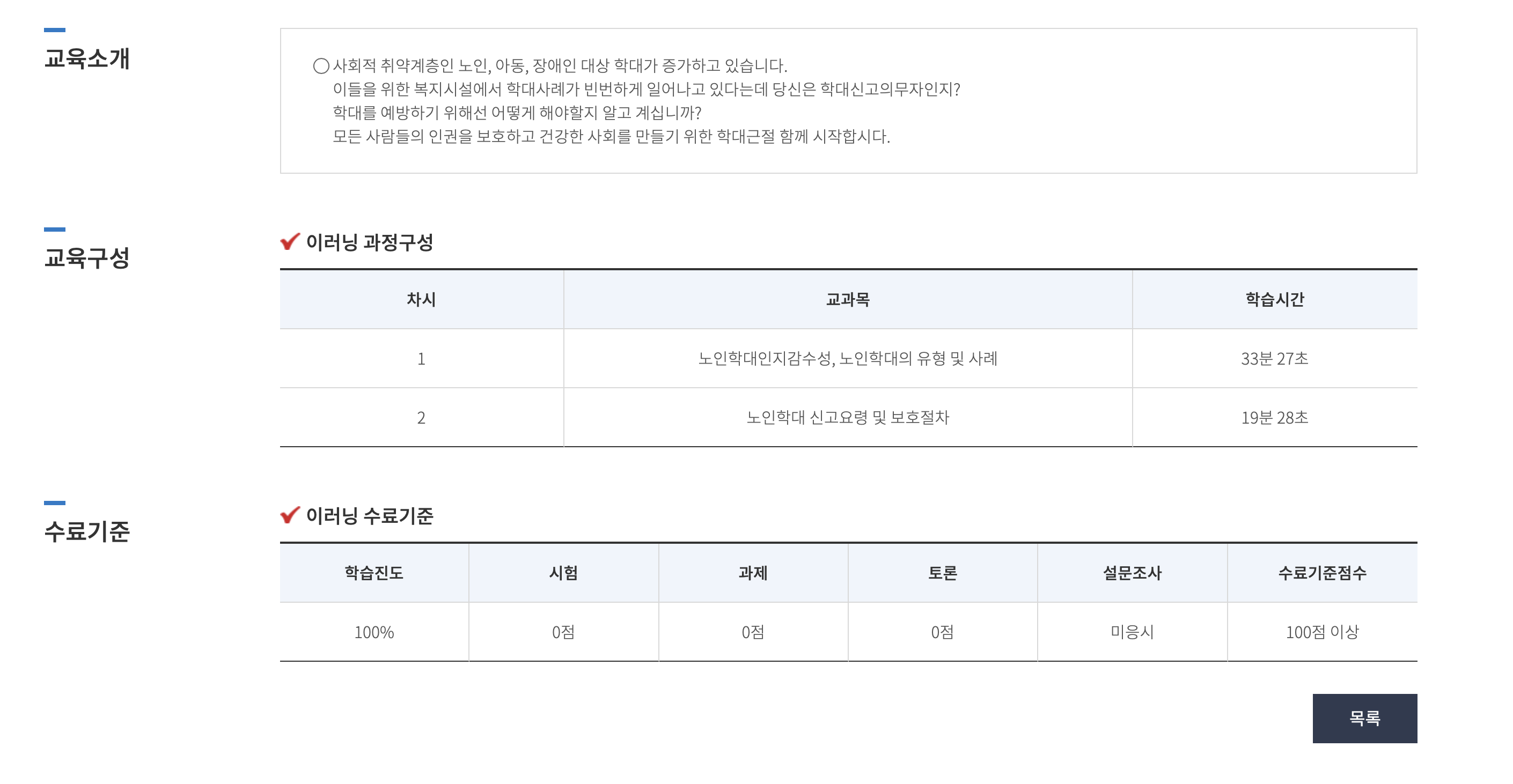 해당교육 수료는 학습진도 1,2차시를 100% 수강하시면 됩니다.