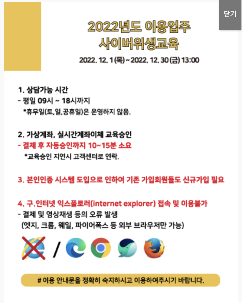 구 인터넷익스플로러는 서비스가 종료됨에 따라 해당 브라우저를 통해 사이버교육을 수강하실 수 없습니다. 엣지, 크롬, 웨일, 파이어폭드 등 브라우저를 이용하시기 바랍니다.