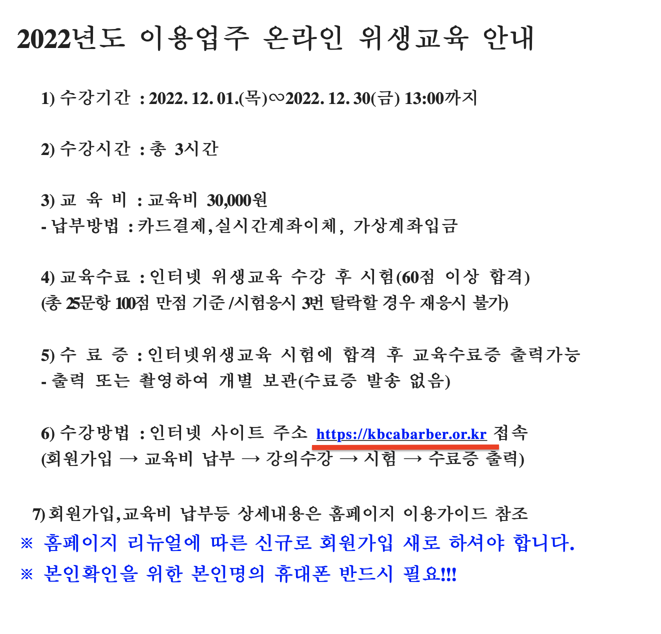 2022 위생교육 인터넷 사이트 주소 = https://kbcabarber.or.kr