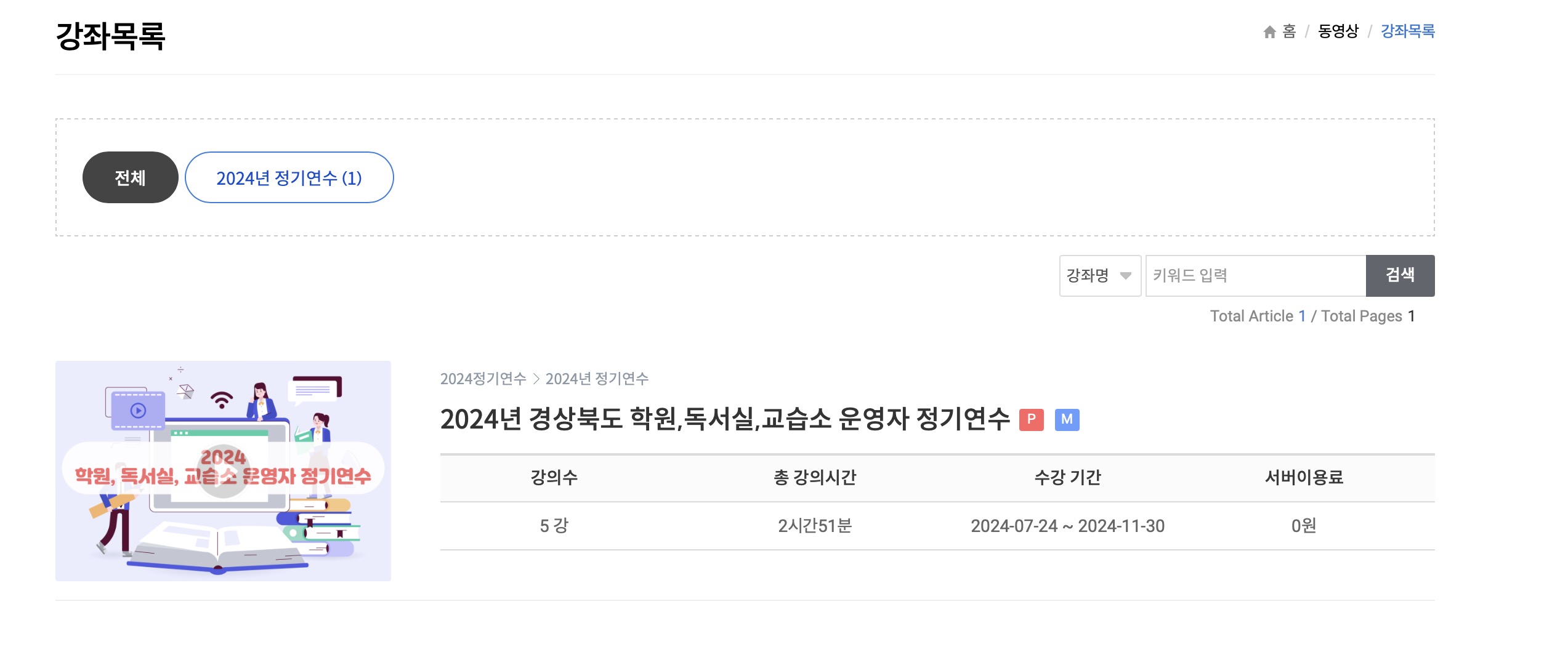 경상북도학원연합회 사이버연수원은 한국학원총연합회 경상북도지회에서 운영하는 온라인 교육 플랫폼으로, 법적으로 필수 이수해야 하는 의무 교육을 제공합니다. 학원 운영자, 학원 차량 담당자, 교육기관 종사자 등을 대상으로 다양한 법정의무교육을 쉽게 온라인으로 이수할 수 있도록 설계되었습니다.