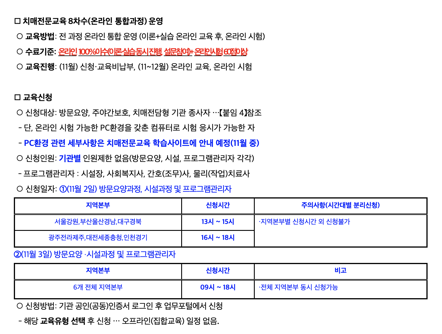 8차수 치매전문교육 교육 및 시험 일정
