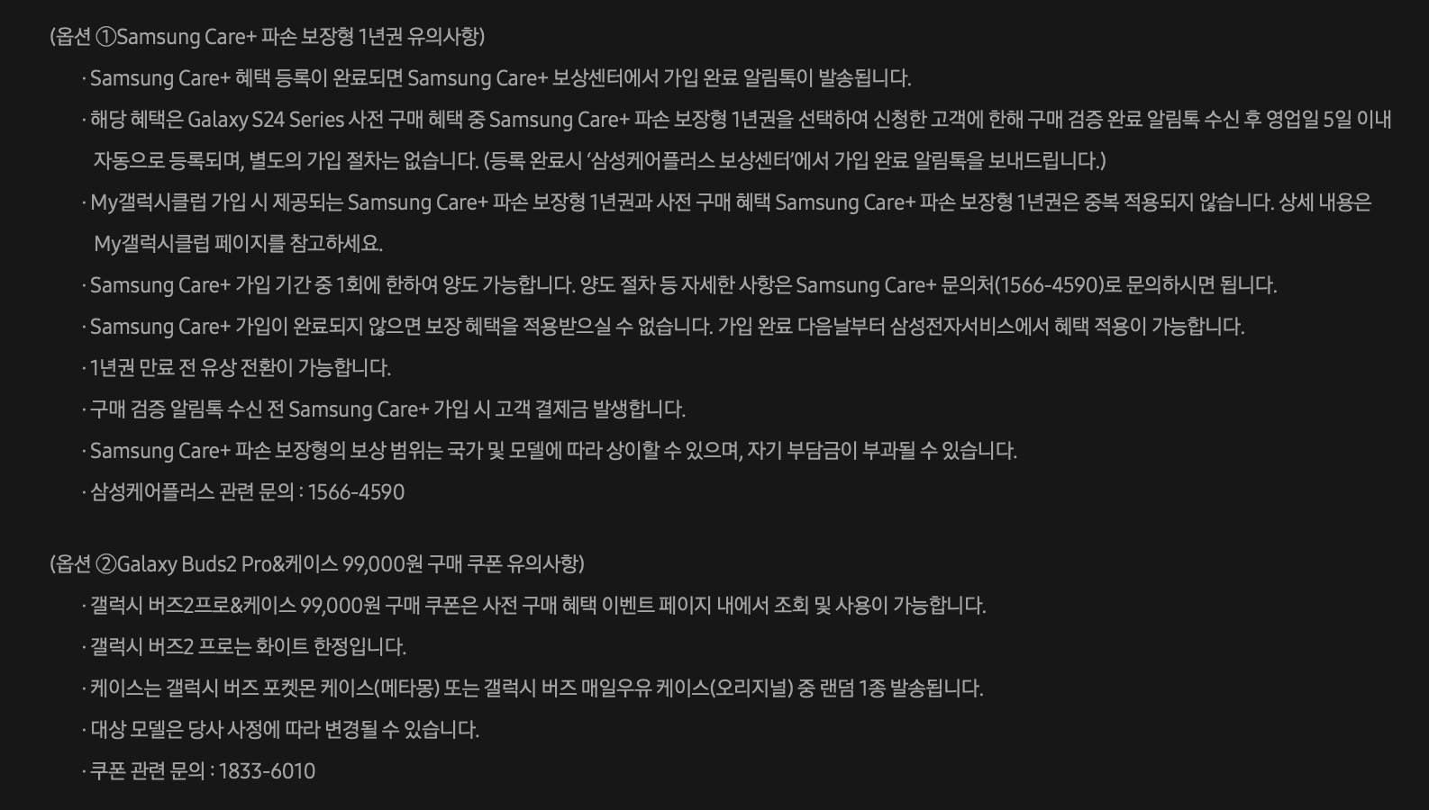 5. 옵션2 갤럭시버즈2 프로 & 케이스 99천원 구매쿠폰 선택 시 : 개통검증 완료 알림톡 수신 후 구매한 갤럭시S24 시리즈 단말로 삼성닷컴 앱 접속 후 사전구매혜택 신청하기에서 쿠폰 사용하여 구매하면 됨.