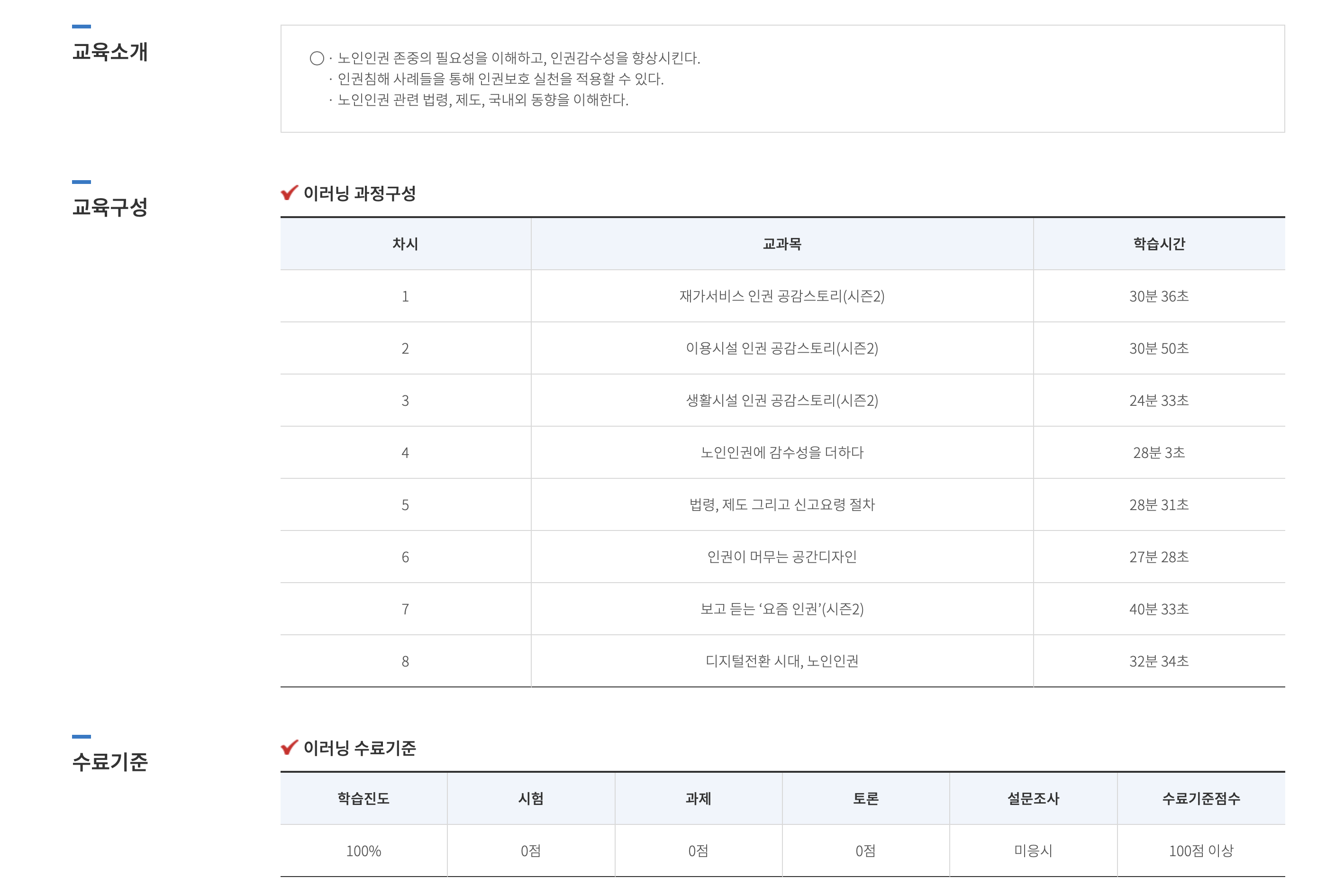 이러닝 교육과정 수료기준은 학습진도 100% 입니다. 시험이나 과제 토론 설문조사는 일체 없습니다.
