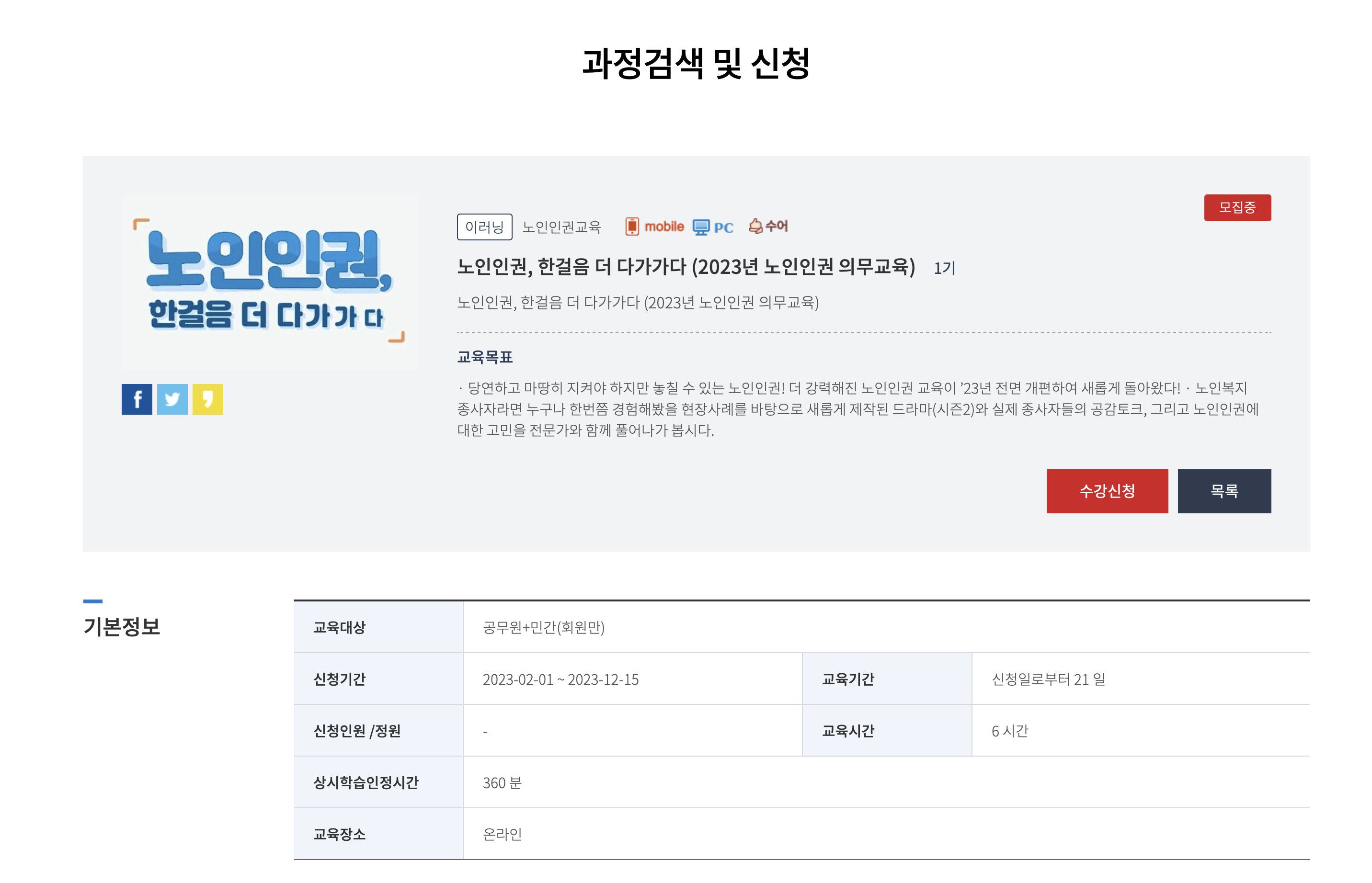 KOHI 한국보건복지배움인 온라인교육 사이트에서는 노인인권 한걸음 더 다가가다 라는 제목으로 노인인권 의무교육을 제공하고 있습니다. 법정의무교육과정으로 공무원+ 민간(회원) 대상 교육입니다.